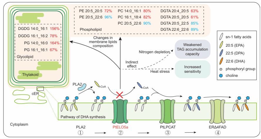 通过蛋白亚细胞定位、基因过表达、Crispr-Cas9介导的基因编辑、以及转录组和脂质组学等研究方法,该研究对三角褐指藻DHA合成的关键酶PtELO5a进行了功能分析。研究发现,ptELO5a突变株除了DHA的生物合成显著受阻之外,还表现出转录组和脂质组成的显著变化,特别是ptELO5a基因敲除影响了藻株甘油三酯的积累。与此同时,突变株对高温(28°C)的敏感性显著增加,分析表明这与内质网膜中磷脂组成及质体中糖脂组成密切相关。此项研究证明了PtELO5a介导的DHA合成在三角褐指藻的生理功能不可忽视,它们在调节膜脂组成、甘油三脂的积累以及降低热敏感性方面发挥了积极作用(图2)。