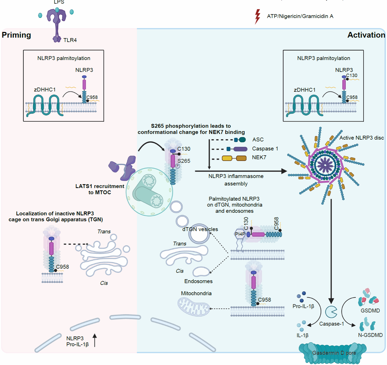 本研究首先揭示了由棕榈酰转移酶zDHHC1介导的NLRP3在C130和C958位点的棕榈酰化修饰对其膜定位和运输的重要性。研究表明,NLRP3在这些位点的棕榈酰化修饰使其能够在线粒体、反式高尔基体囊膜(TGN)和内体等多重膜结构之间动态穿梭,并最终转运至微管组织中心(MTOC)—炎性小体组装的关键场所。进一步的研究发现,除了棕榈酰化修饰介导的NLRP3向MTOC的转运外,NLRP3在到达MTOC后的磷酸化修饰也是炎性小体活化与装配的关键。研究团队发现,LATS1和LATS2蛋白激酶在Priming阶段预先被招募至MTOC,在NLRP3到达后通过磷酸化其S265位点,促进NLRP3构象变化,从而与NIMA相关激酶7(NEK7)相互作用。这一事件解锁了多聚化NLRP3的“笼状”结构,驱动了炎性小体的组装与活化。同时,研究者还通过小鼠和斑马鱼模型,进一步验证了NLRP3棕榈酰化修饰在进化中的保守性及zDHHC1对NLRP3棕榈酰化修饰功能的重要性。zDHHC1缺失的脓毒血症动物模型炎症反应显著减弱,存活率显著提高,暗示抑制zDHHC1催化的NLRP3棕榈酰化修饰可能成为治疗NLRP3相关炎症疾病的新策略。综上,本研究系统性地揭示了NLRP3在炎性小体活化过程中复杂的多重翻译后修饰对其膜转运及后续活化的影响,并为NLRP3介导的炎症反应提供了新的治疗靶点(图2)。