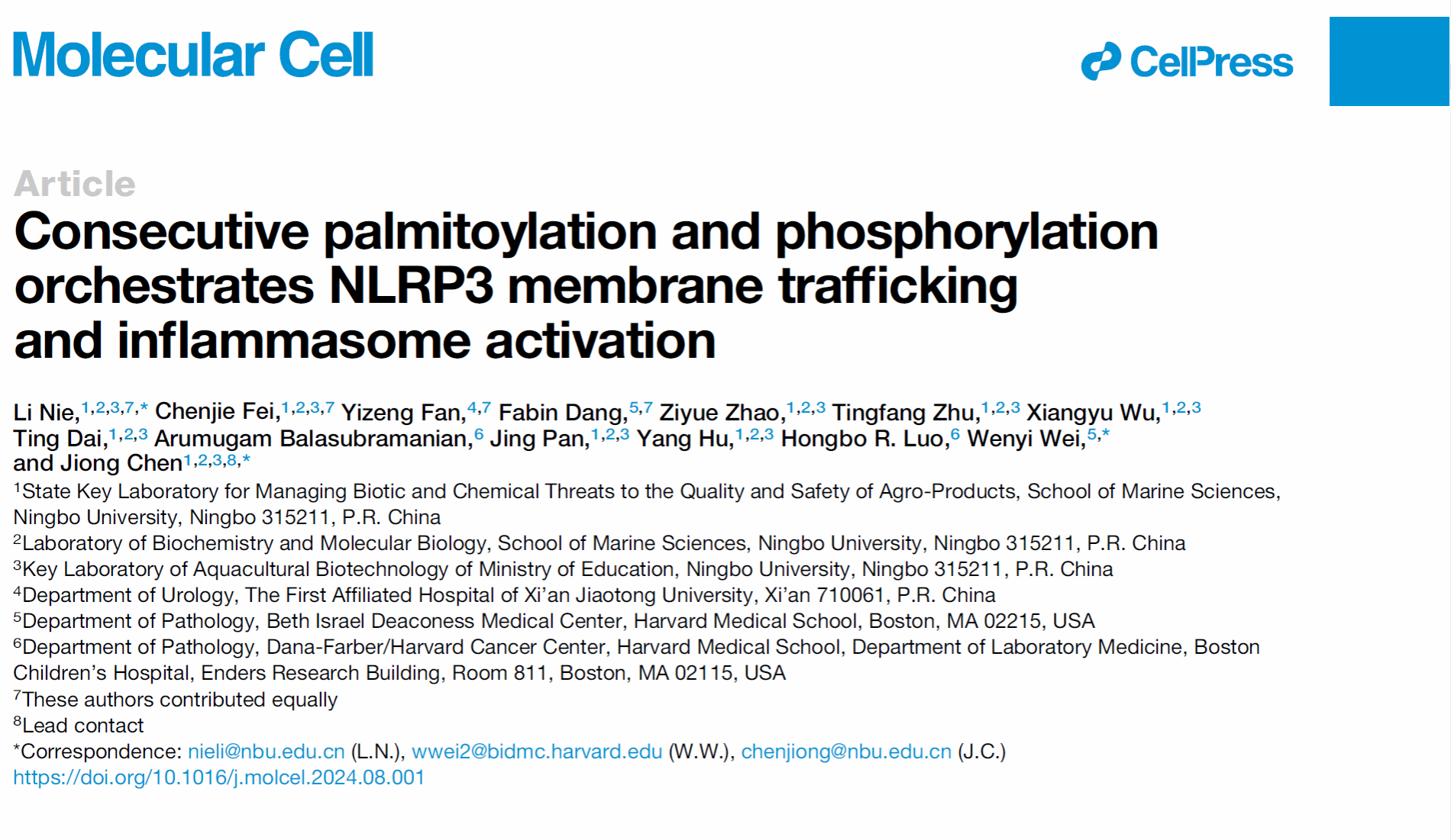 、农产品质量安全危害因子与风险防控国家重点实验室陈炯研究员团队在《Cell》经典子刊《Molecular Cell》正式发表题为“Consecutive palmitoylation and phosphorylation orchestrates NLRP3 membrane trafficking and inflammasome activation”的最新研究成果(图1),深入解析了顺序性的棕榈酰化和磷酸化修饰调控NLRP3蛋白胞内多重膜结构间动态运输及炎性小体组装与活化的分子机制。