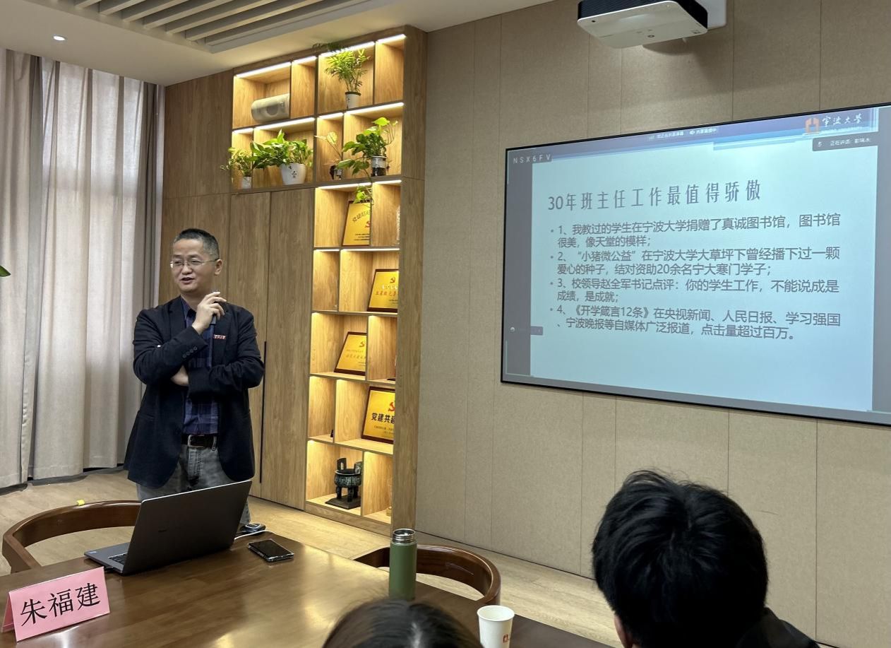 朱福建老师深入分享了他作为班主任三十年来积累的宝贵工作经验。在三十年的教育生涯中,他始终秉持着爱心和责任心,将每一位学生视如己出,认为他们不仅是学校的孩子,更是社会和家庭的未来。他指出,作为一名班主任,要搭建一个富有凝聚力和正能量的团队,营造出一种彼此信任、共同成长的氛围,这样才能帮助学生在大学生活中健康快乐地成长。