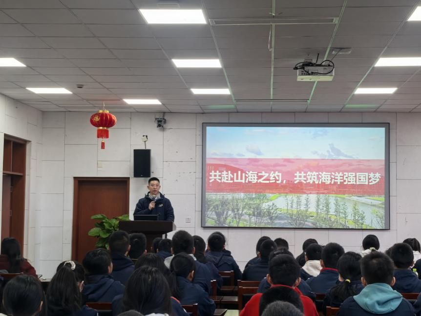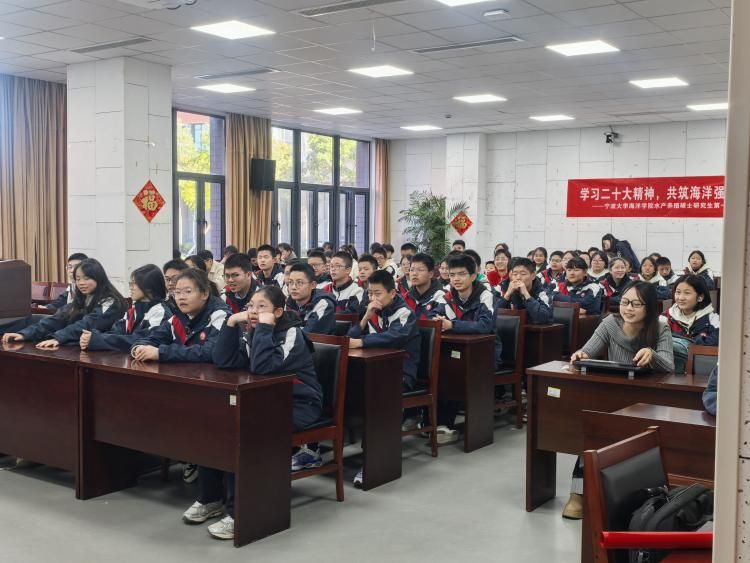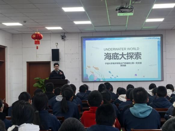 潜心科研的教授们一生与海洋同行,在几十年如一日的付出下不断攻克水产养殖繁殖率低、不易存活等难题的故事,启迪同学们坚定信念,为梦想而坚持。研究生党员贾同鹏以《海底大探险》为题,从自己的学科研究方出发,介绍了习近平总书记提出的“大食物观”、建设“海洋牧场”及“蓝色粮仓”等目标和方向,激励中学生能以此为梦想做好水产动物的医生。本科生第二党支部党员黄文莲开展微课宣讲《从一方鱼塘到万亩汪洋》,以自身从中学到大学再到保研清华的经历,激励中学生专注当下、把握现在。