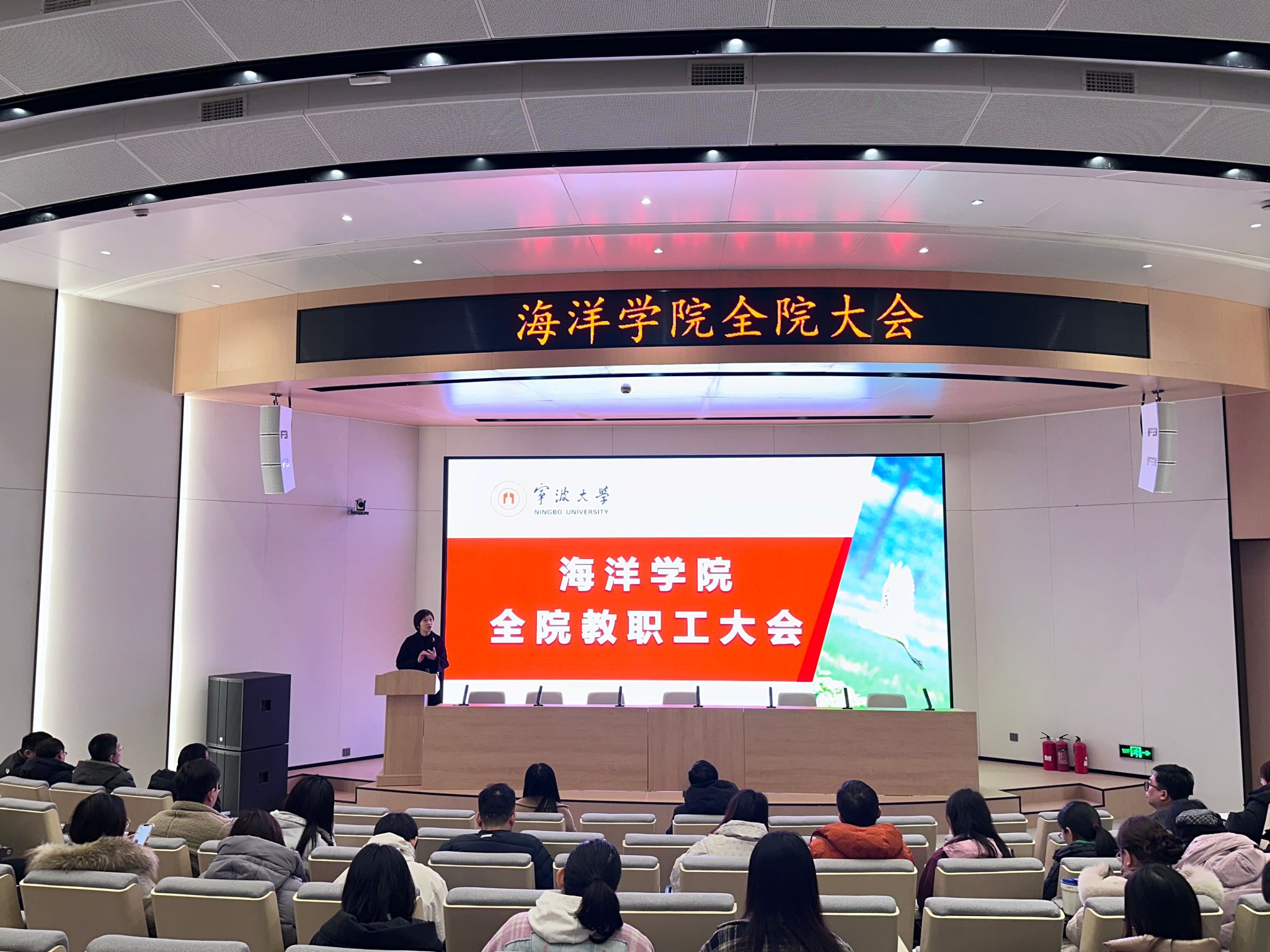 2025年新学期全院教职工大会在梅山校区中试基地一楼报告厅召开,学院党委书记邵丽主持会议,全体教职工出席。