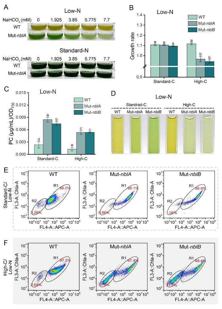 藻胆体(PBS)是蓝藻等光合生物中的主要光收集装置,其降解能为细胞提供大量氮源,供给细胞生长与代谢。在受到氮限制时,蓝藻会降解藻胆体,导致细胞失绿黄化,但氮限制是不是诱导蓝藻降解藻胆体的充分条件尚不清楚,碳/氮平衡与蓝藻藻胆体降解之间的互作与反馈调控机制仍未被揭示。