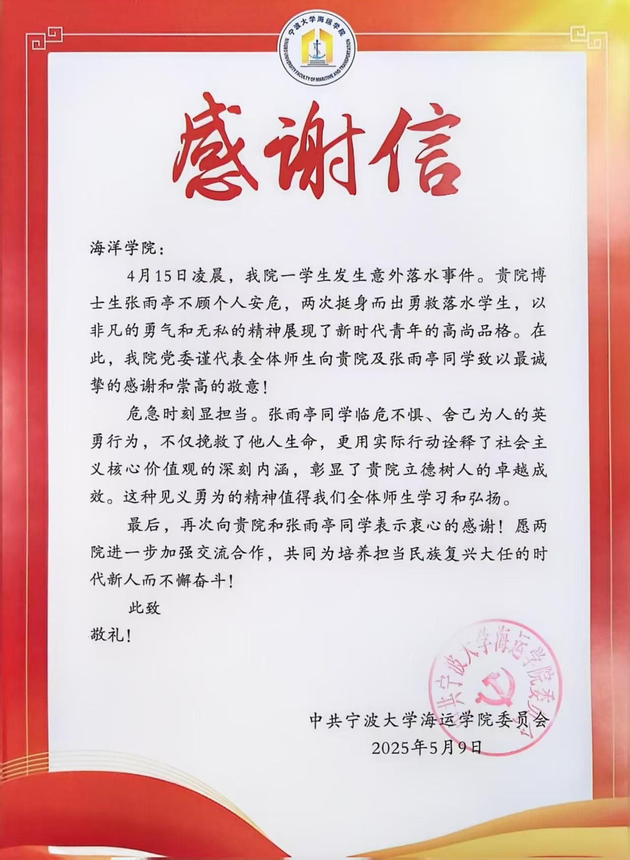 学子的优秀品德和强烈的社会责任感。在他人生命面临危险时英勇施救,这种非凡的勇气和无私的精神值得全体师生学习。