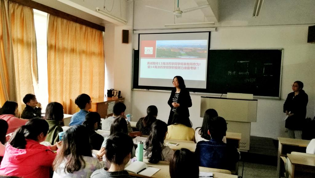 何山对13级海药班考研取得好成绩表示祝贺,并指出:“海洋药学专业要率先建设成为研究型专业,主要目标是培养拥有国际化视野、热爱科研的学术型人才,预祝明年14级海药班更上一层楼”。金海晓介绍了13级学生考研的总体情况,给14海药学生树立了榜样和标杆。