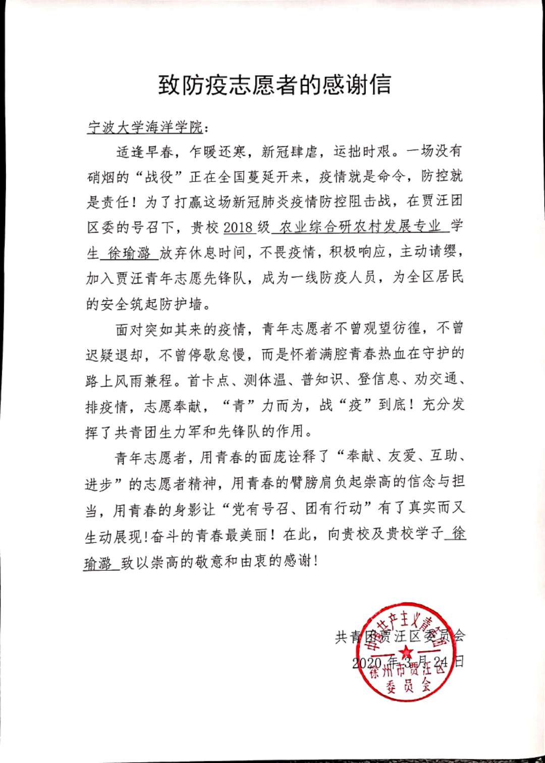 2020年伊始,一场突如其来的新型冠状病毒肺炎疫情打乱了人们的生活,当徐瑜潞看到家乡区团委发布的疫情志愿者征集令后,选择第一时间主动报名,成为老矿街道的一名“列兵”。她说:“当初选择农村发展专业的初衷就是希望有朝一日能够学以致用,为振兴乡村贡献绵薄之力。而今疫情严重,我不是医务工作者,不能奋战在防疫一线,但能加入到贾汪志愿者的队伍中来,为人民服务,为家乡的防疫战做点什么,是我的责任和荣幸。”