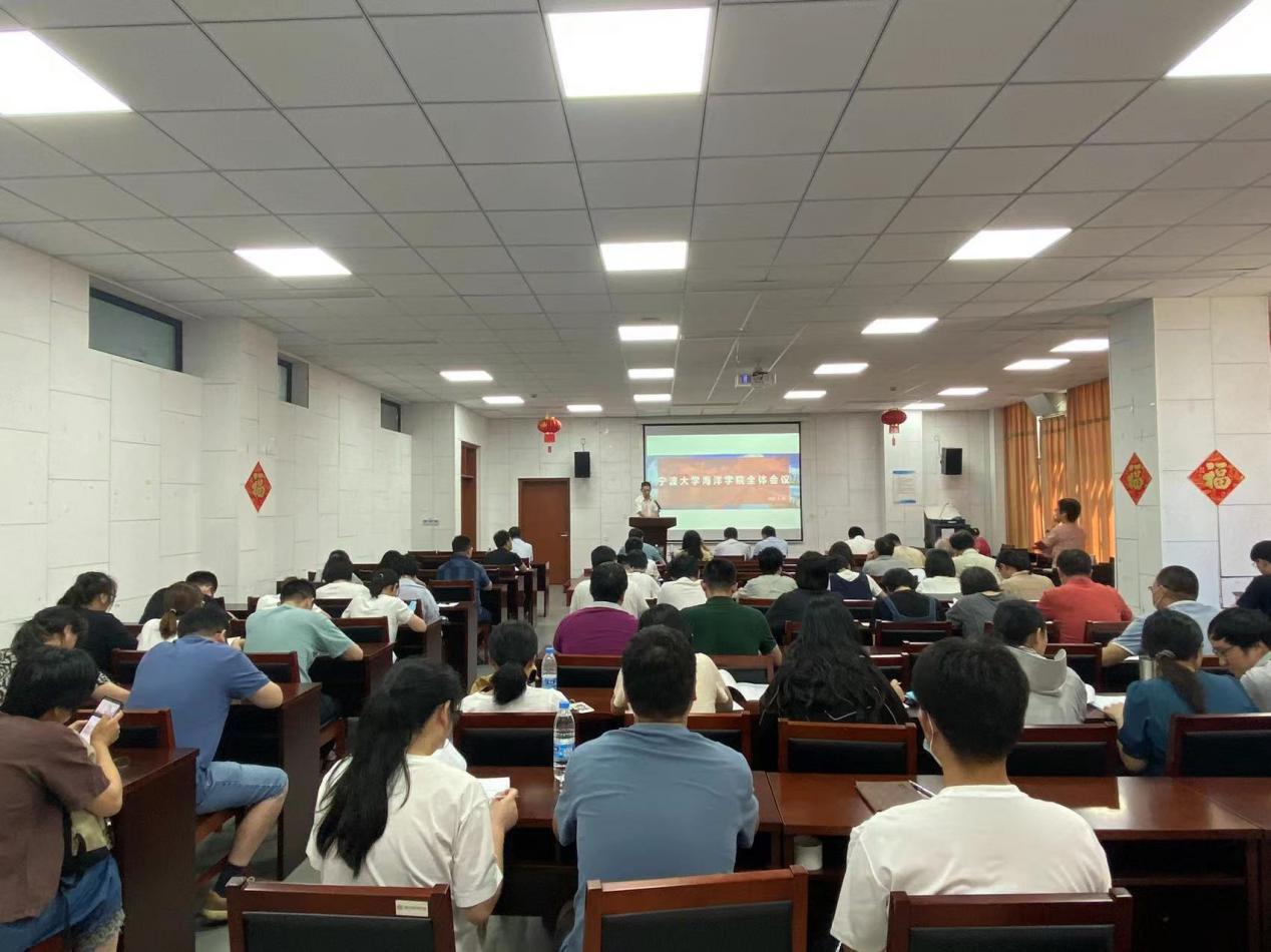 会议开场举行了简单温馨的新进教师欢迎仪式,院长王春琳为新海洋人佩戴校徽、赠送礼品。