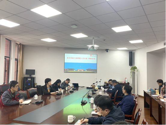 3月8日下午,在海洋学院召开2022年行政管理人员年度/聘期考核会。院党政领导班子成员,学位点负责人、专业负责人、系主任、班主任代表等参加。会议由党委书记邵丽主持。