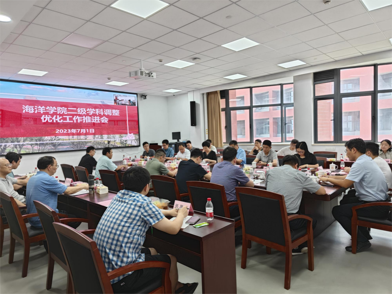 二级学科调整优化工作推进会,会议邀请了机械学院、信息学院、土环学院、食药学院、材化学院、商学院、海运学院、医学部等相关学院和部门负责人参加研讨,学院全体党政领导、学术委员会成员、学科专家组成员以及学术团队负责人等参加了此次会议。会议由学院特聘院长王春琳主持。
