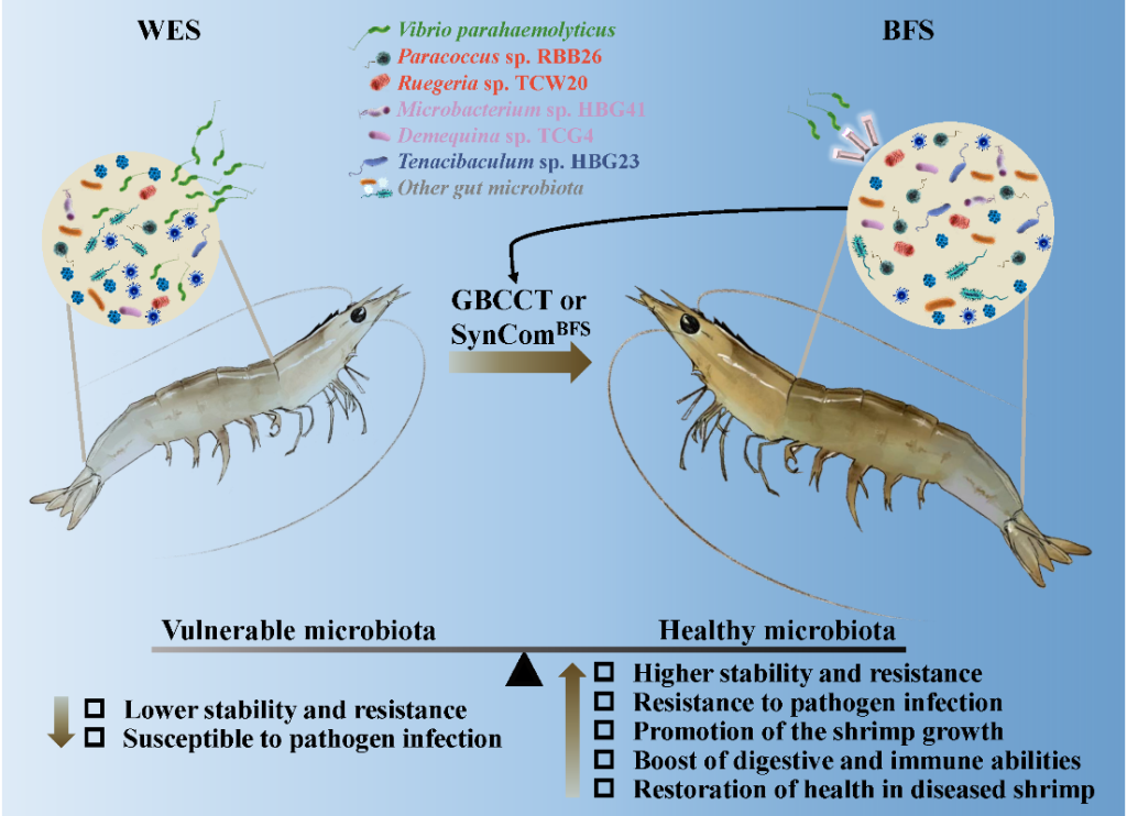 我国凡纳滨对虾养殖产量占世界产量的40%以上,终端消费市场价值超过2000亿元。然而,对虾养殖业近年来深受病害频发的困扰,尤其在幼虾养殖阶段,由副溶血性弧菌(Vibrio parahaemolyticus)引起的急性肝胰腺坏死或早期死亡综合征往往导致幼虾在放养30天内全部死亡,成为制约对虾养殖业发展的卡脖子问题。前期研究表明,生物絮团技术养殖的对虾具有高的抗病性,且与对虾肠道中富集的特定类群高度相关,但是它们之间的因果关系及作用机制仍不清楚。
