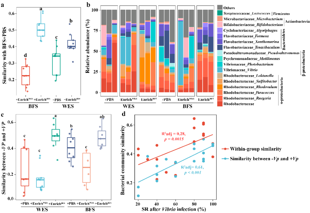 本研究发现生物絮团养殖模式下对虾成活率和产量都显著高于传统换水模式,弧菌侵染后絮团虾开始出现死亡的时间显著晚于换水虾,成活率比换水虾显著提高了30%以上,且絮团虾肠道中毒力基因拷贝数显著低于换水虾,表明絮团养殖增加了对虾抗弧菌侵染的能力。进一步研究发现将絮团虾粪菌移植到换水虾肠道后,可显著提升后者的抗弧菌侵染能力,且这种抗病性与其肠道微生物群落的稳定性的提高显著正相关。