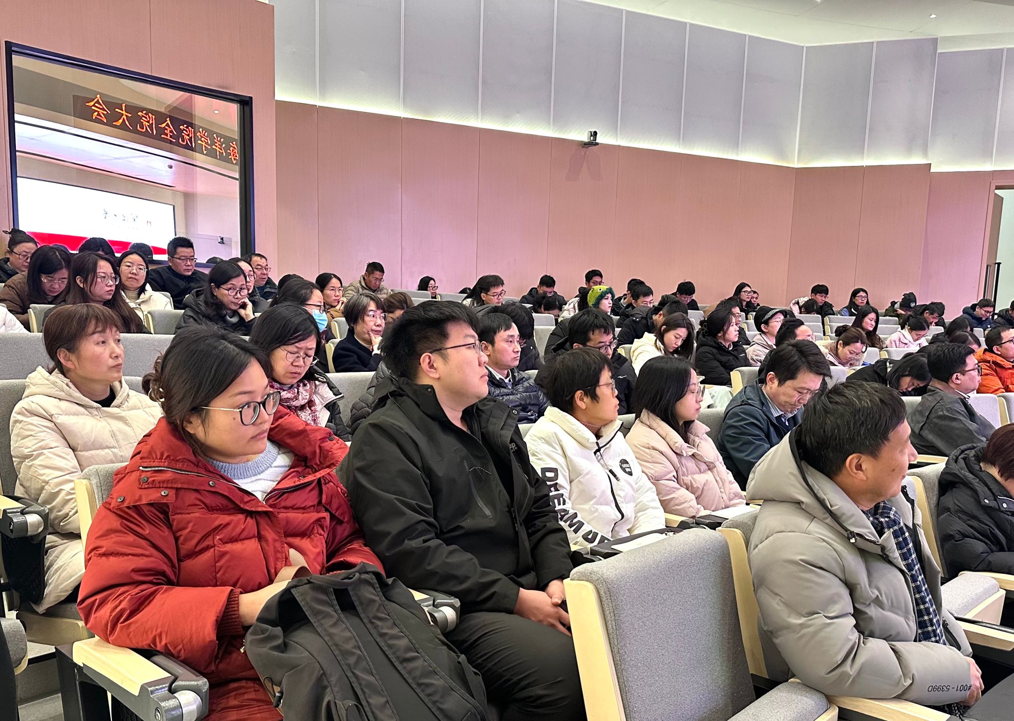2025年新学期全院教职工大会在梅山校区中试基地一楼报告厅召开,学院党委书记邵丽主持会议,全体教职工出席。