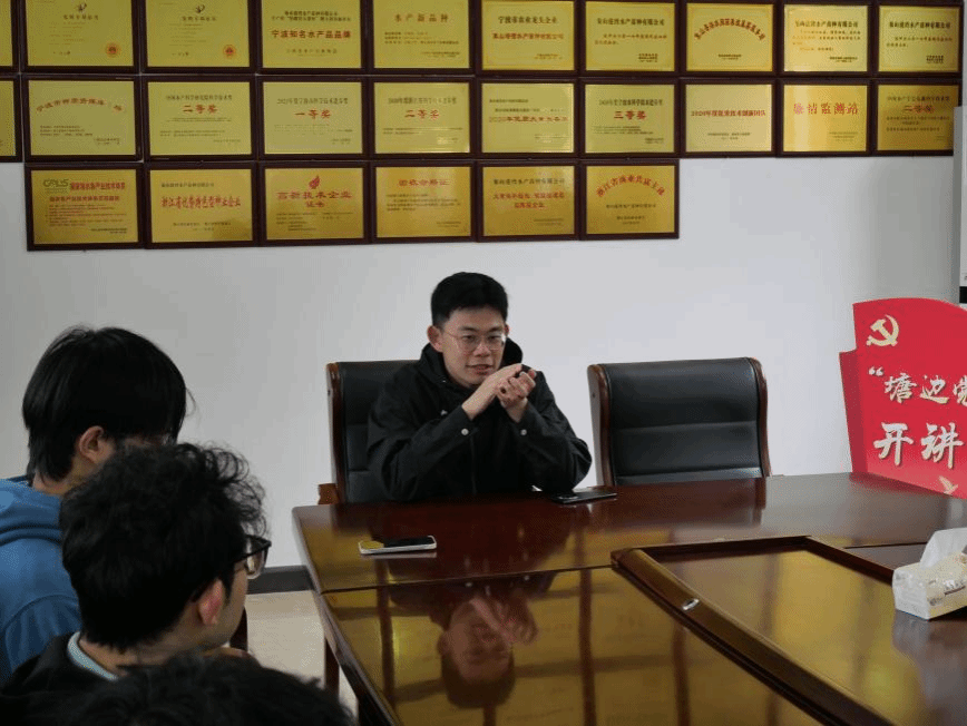 在参访过程中,企业技术负责人陶顺顺带领师生实地观摩了育苗车间、生态养殖池,深入了解企业在节能减排、苗种选育等方面的创新实践。活动期间,全国高校“双带头人”教师党支部副书记彭瑞冰老师以“中央一号文件引领下的渔业现代化路径”为主题讲授塘边党课,强调水产行业理论与实践并重的理念。