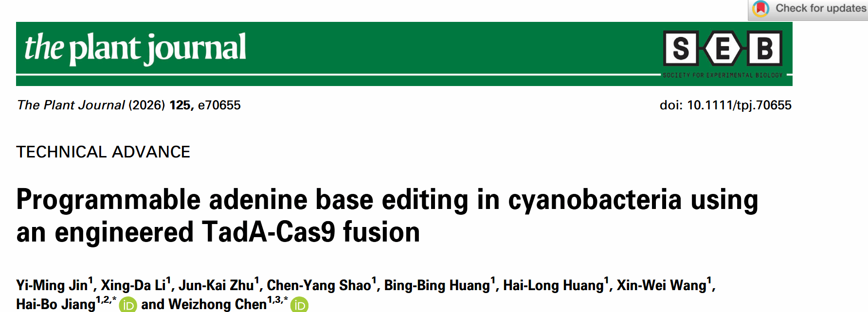 近日,宁波大学海洋学院姜海波教授团队成功开发出一种适用于蓝藻的新型腺嘌呤碱基编辑器,实现了蓝藻基因组中特定位点A•T到G•C的高效精准编辑。该成果以“Programmable adenine base editing in cyanobacteria using an engineered TadA-Cas9 fusion”为题,发表于植物学领域知名期刊《The Plant Journal》(图1)。