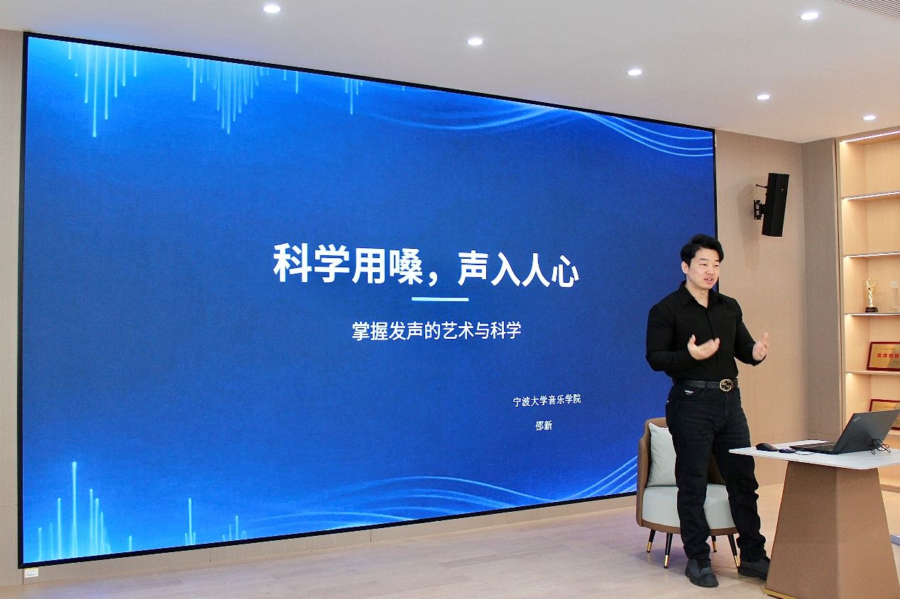 互动环节中,邵老师带领大家进行“哼鸣练习”,从低音“嗡”开始,逐步上行,注重气息均匀与声音连贯。他强调应以气息推动声音,避免喉部紧张,并对常见问题给予个别指导。最后,邵老师提出日常护嗓建议,包括适时饮用温水、避免在嘈杂环境中过度用声,以及通过适时“噤声”缓解声带疲劳。