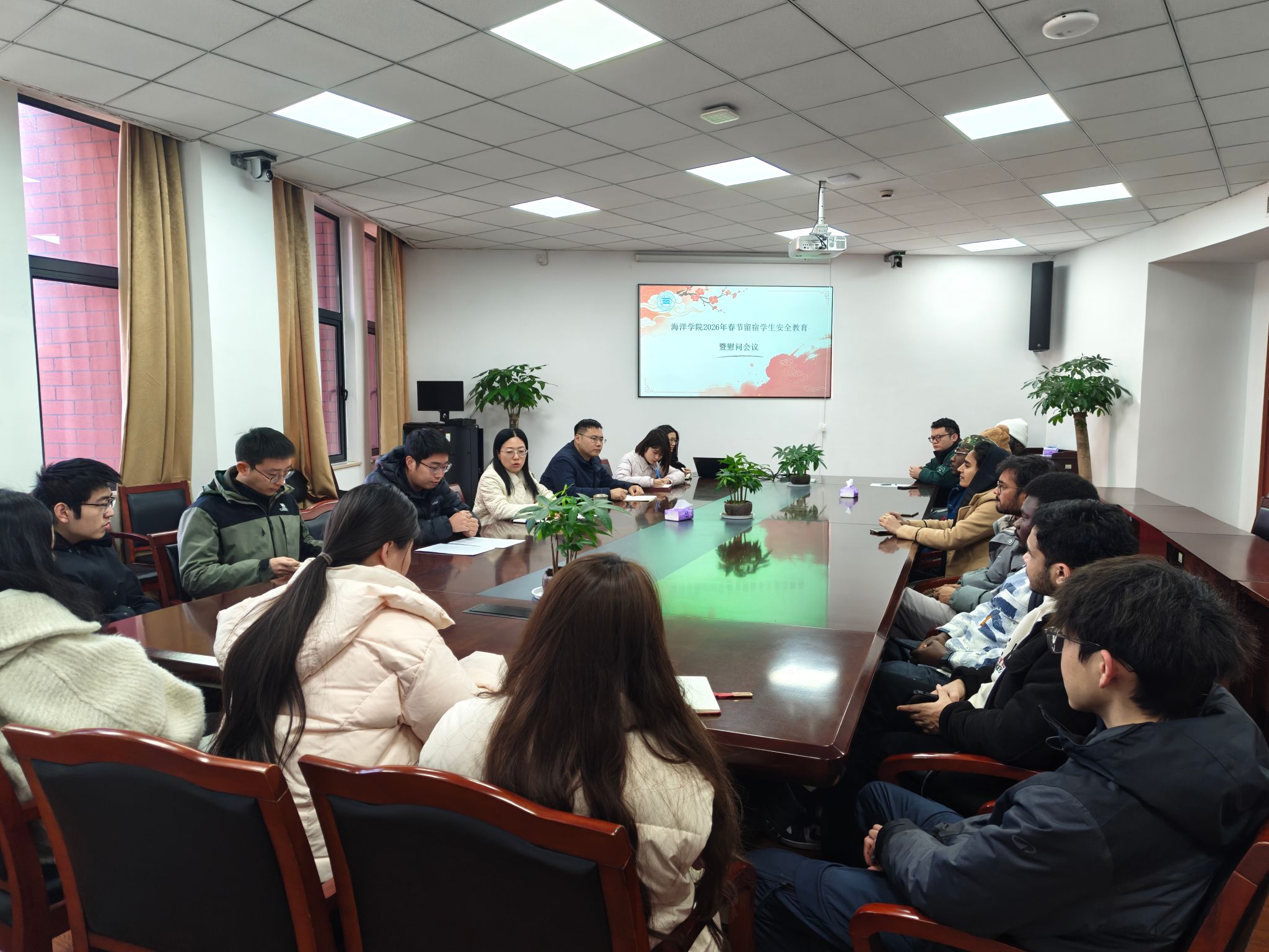 在竺银康楼303会议室举行了春节留校学生安全教育会议暨慰问座谈会。学院党委副书记张乐、辅导员以及16名留校学生参会。