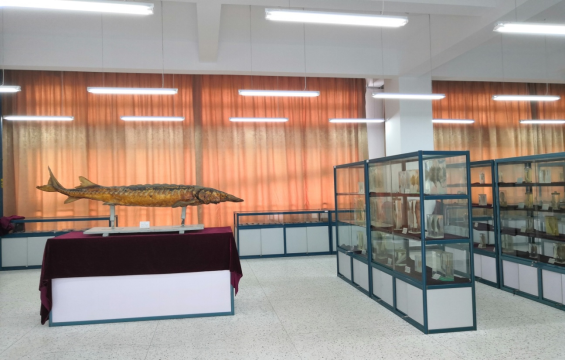 梅山校区中试基地水族馆楼内,其海洋生物标本馆建筑面积约1300㎡,使用面积约800㎡,展厅500㎡,标本储藏室200㎡;并配有150㎡的映像室。标本馆内共展出1000多种海洋生物,其中鱼类展区有标本300多种,有珍贵标本中华鲟等;