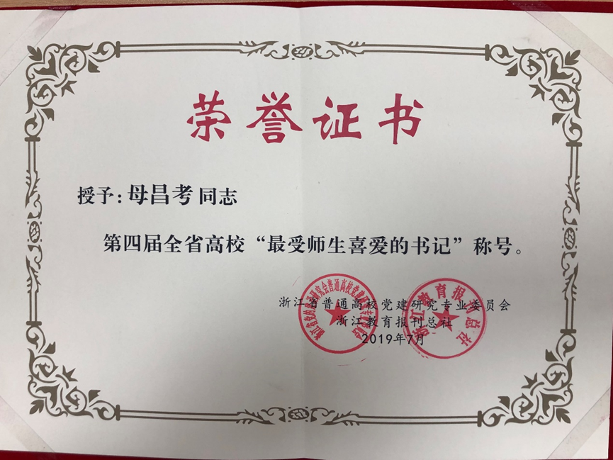2019年7月,母昌考获评浙江省最受师生喜爱的书记荣誉称号