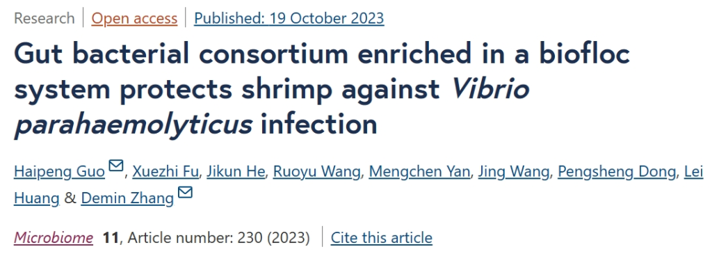 张德民教授和郭海朋副教授团队发现,生物絮团技术养殖的凡纳滨对虾具有高的抗弧菌侵染性能,微生物组学研究发现絮团虾肠道显著富集了某些特异性的细菌类群,进一步通过粪菌移植和人工合成菌群构建证实了这些特异性的细菌类群可以显著提升肠道菌群的稳定性和消化免疫能力,进而增强了对弧菌侵染的抗性。研究成果以“Gut bacterial consortium enriched in a biofloc system protects shrimp against Vibrio parahaemolyticus infection”为题发表在《Microbiome》(IF=15.5)。该研究得到了宁波市重大专项等项目的资助。