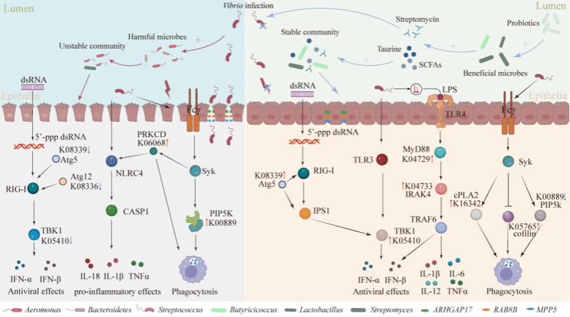 对虾白便综合症(WFS)致病源未知,推测多病原体共感染所致;受“一病一因”法则的限制,缺乏因果关系验证,进而阻碍了精准设计拮抗菌。本研究首先通过核心种,区分宿主健康状况等模型推测Vibrio fluvialis, V. coralliilyticus和V. tubiashii为WFS潜在病原菌并侵染验证。动态干预模拟设计出四株拮抗菌(Ruegeria lacuscaerulensis, Nioella nitratireducens, Bacillus subtilis和Streptomyces euryhalinus),可以有效拮抗WFS,显著提高对虾的WFS抗性和生长性状。拮抗菌通过富集肠道有益菌群,促进链霉素、短链脂肪酸、牛磺酸的合成通路直接抑制病原菌。同时,益生菌可以提高菌群互作网络的稳定性和肠壁紧密连接,降低肠道菌群的周转率和平均变异度形成防御病原体的生态和机械屏障。此外,对虾的免疫途径,如Fcγ R介导的吞噬、TLRs和RIG-I受体信号通路被激活,增强抵御病原体的免疫屏障。本研究为多病原菌的鉴定和对症(多病原菌找药(拮抗组合菌)的提供了例证,并从益生菌-肠道菌群-宿主免疫轴角度,从生态、机械和免疫屏障多维度揭示了拮抗菌提高宿主抗病性的机制。