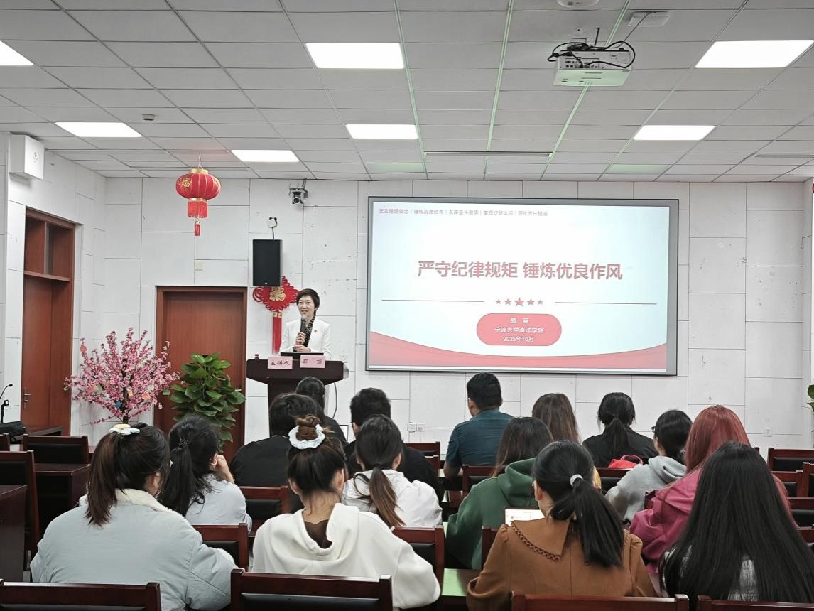 课程最后,邵丽结合党的二十届四中全会精神学习要求,鼓励同学们关注时政热点,通过权威媒体解读等方式深化学习效果,将个人发展与党的事业紧密结合。她勉励海洋学子身处优秀集体,更要以高标准自我要求,期望全体学员都能成为务实笃行的行动者,将党组织与学院的期许内化于心、外化于行,在未来各个赛道上让共产党员的身份闪闪发光。