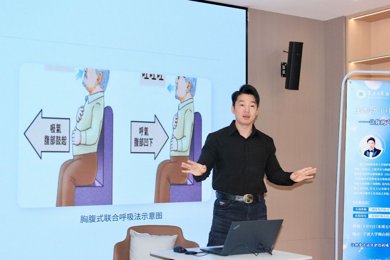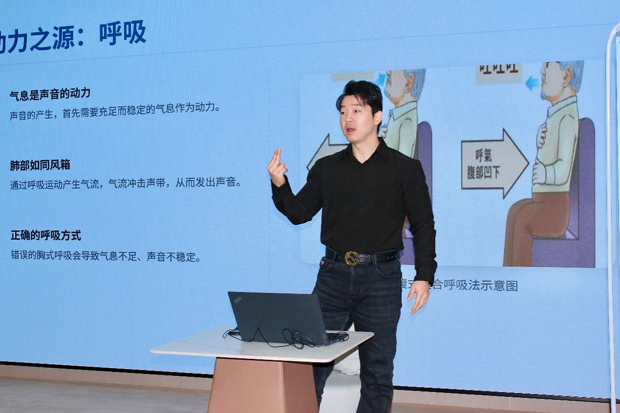 互动环节中,邵老师带领大家进行“哼鸣练习”,从低音“嗡”开始,逐步上行,注重气息均匀与声音连贯。他强调应以气息推动声音,避免喉部紧张,并对常见问题给予个别指导。最后,邵老师提出日常护嗓建议,包括适时饮用温水、避免在嘈杂环境中过度用声,以及通过适时“噤声”缓解声带疲劳。