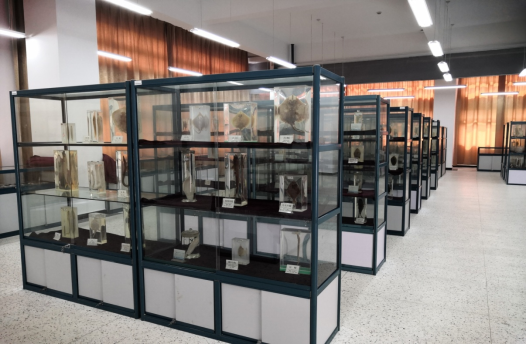 梅山校区中试基地水族馆楼内,其海洋生物标本馆建筑面积约1300㎡,使用面积约800㎡,展厅500㎡,标本储藏室200㎡;并配有150㎡的映像室。标本馆内共展出1000多种海洋生物,其中鱼类展区有标本300多种,有珍贵标本中华鲟等;